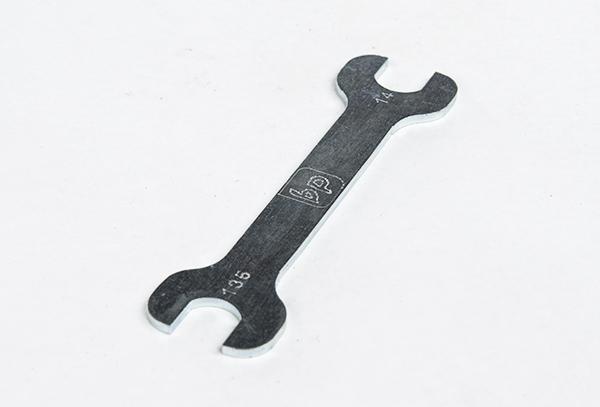 Om uw wielen te vervangen, heeft u een speciale steeksleutel nodig. Deze steeksleutel is extra plat en heeft aan een uiteinde maat 14, en aan het andere uiteinde maat 13,5.